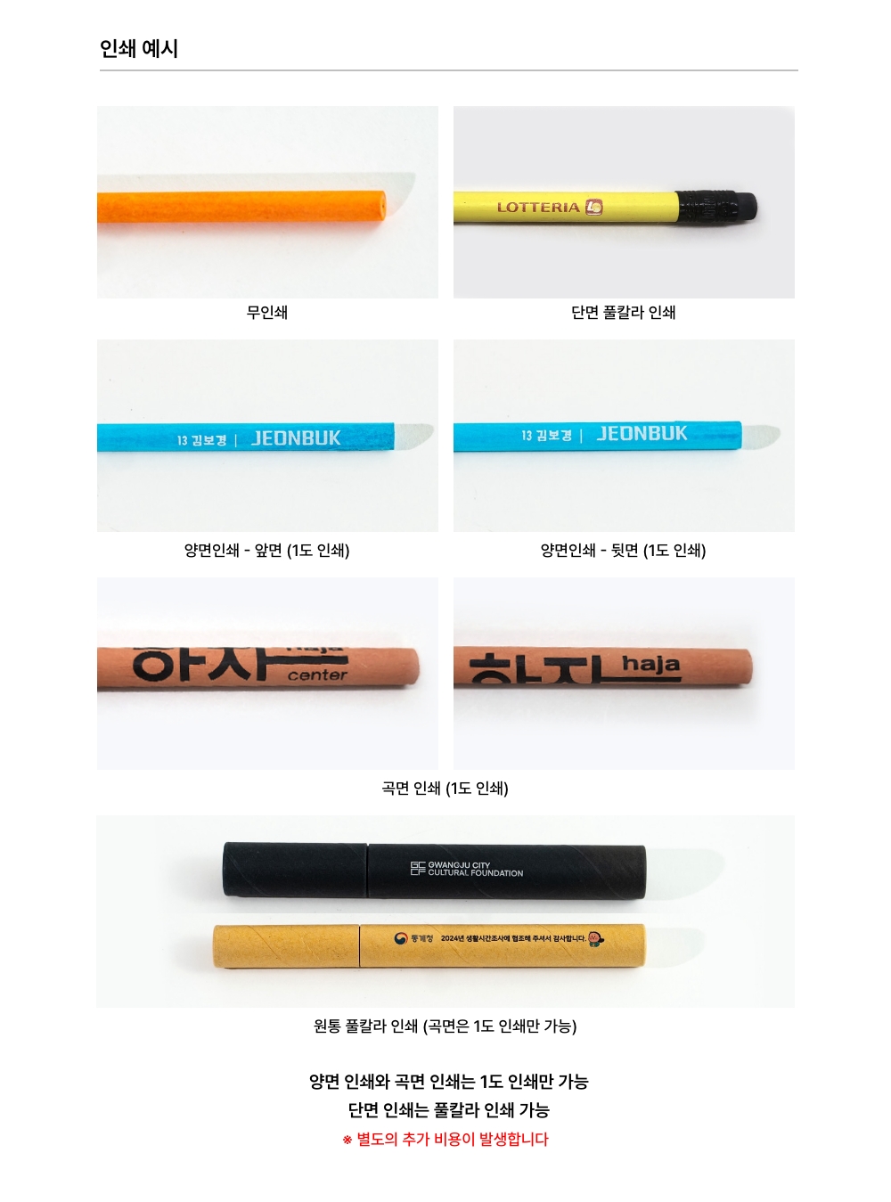 1.±âº»¼ö·®Àº ¿¬ÇÊ 1,000ÀÚ·ç ±âÁØÀÔ´Ï´Ù. (ÃÖ¼Ò¼ö·® ¹Ì¸¸ ½Ã Àμâºñ Ãß°¡ ÀÖ½À´Ï´Ù.) -¿¬ÇÊ 1,000ÀÚ·ç, 3º»ÀÔ 300¼¼Æ®, 5º»ÀÔ 200¼¼Æ®, 10º»ÀÔ 100¼¼Æ® µî 2.ÃÖ¼Ò¼ö·® ¹Ì¸¸ ½Ã Àμâ Ãß°¡ ºñ¿ë ¹ß»ýÇÕ´Ï´Ù. 3.Àμâ´Â 1µµ °î¸éÀμ⠶Ǵ uv ǮĮ¶ó Àμ⠰¡´ÉÇÕ´Ï´Ù. -¿øÇü ¿¬ÇÊ, ¿øÅëÀº 1µµ °î¸éÀμâ (¾Õ, µÚ µÎ ±ºµ¥ ¶Ç´Â °î¸éÀ¸·Î µ¹¾Æ°¡¸é¼ Àμ⠰¡´ÉÇÏ¸ç ¾ç¸éÀμâ Ãß°¡ ºñ¿ë ¾ø½À´Ï´Ù.) (*À°°¢, ¸ù´ç ¿¬ÇÊÀº ÇÑ ¸é¸¸ Àμ⠰¡´ÉÇÕ´Ï´Ù.) -¿¬ÇÊ, ¿øÅë uv ǮĮ¶ó Àμâ´Â ´Ü¸é ÀμâÀÔ´Ï´Ù. 4. ¿¬ÇÊ Àμâºñ´Â ¹«·áÀ̳ª, ¿øÅë Àμ⠽à (1µµ °î¸é ½ÇÅ©Àμ⠶Ǵ ǮĮ¶ó ´Ü¸éÀμâ) Ãß°¡ºñ¿ë ¹ß»ýÇÕ´Ï´Ù. 5. ¿øÅë »ö»ó º¯°æ °¡´É ÇÕ´Ï´Ù.